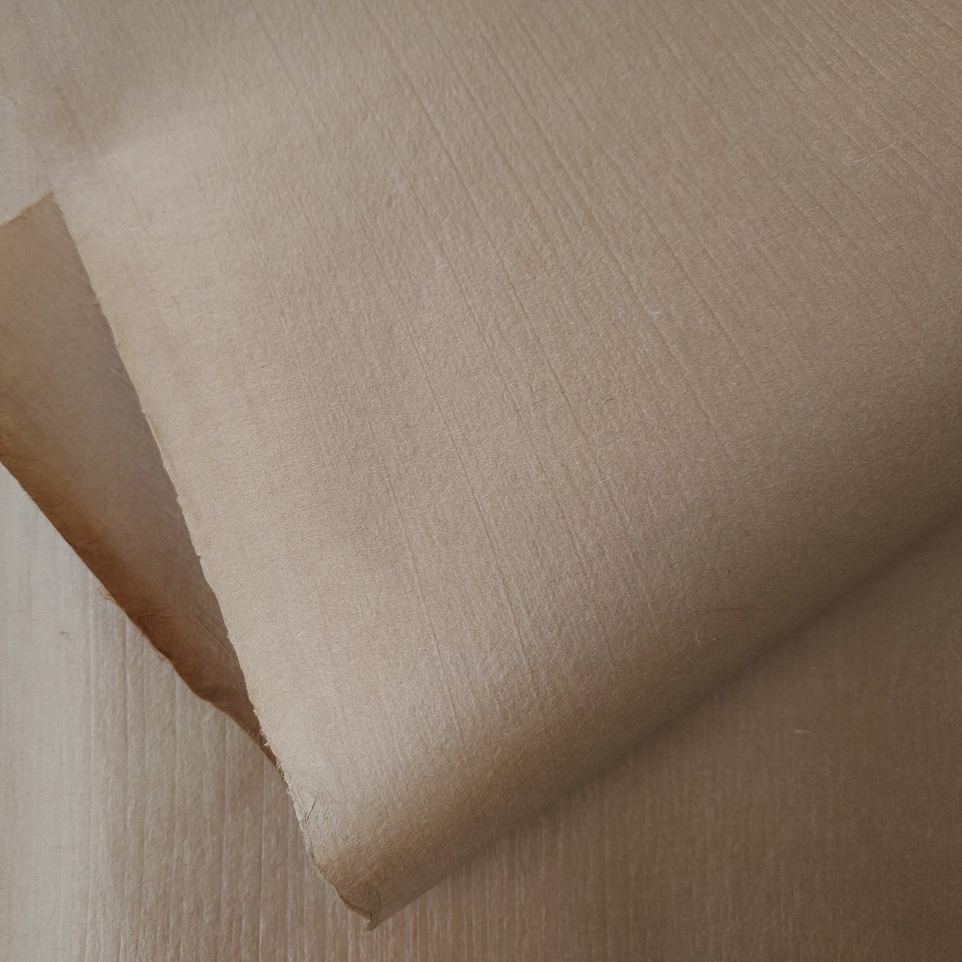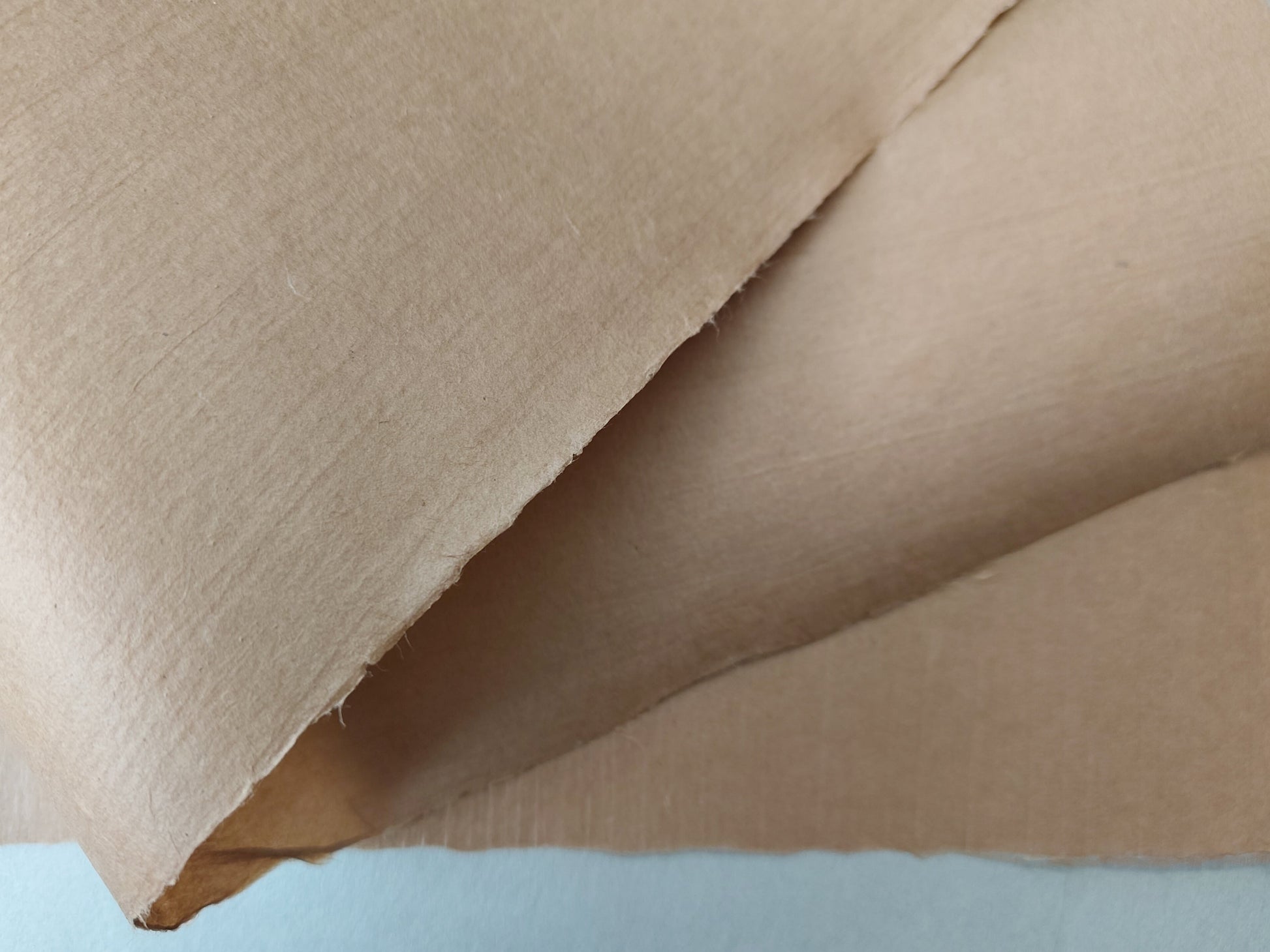 This beautiful and light paper is characteristically crisp from the Japanese Gampi fibres contained within it. The warm, brown colouring is attained with a natural dye process of Catechu - a plant extract from the acacia tree. It is then dried on wooden boards - the impressions of the boards remains on the paper.